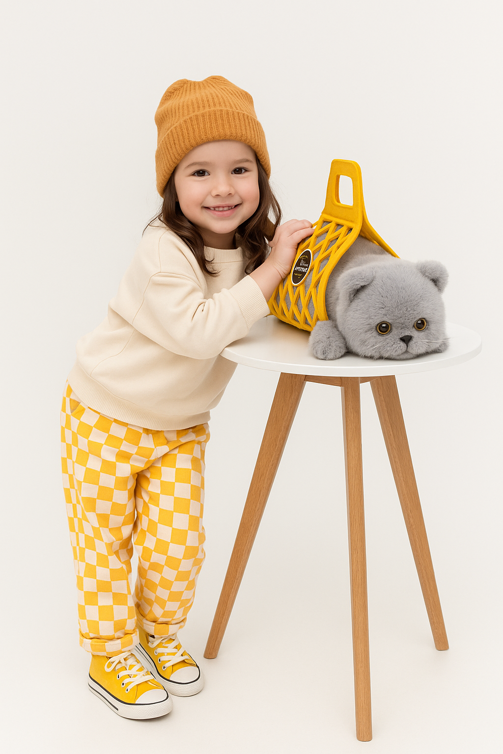 Dank seines praktischen, gelben Filzkörbchens mit Tragegriff fühlt er sich nicht nur geborgen, sondern ist auch unterwegs immer sicher dabei.