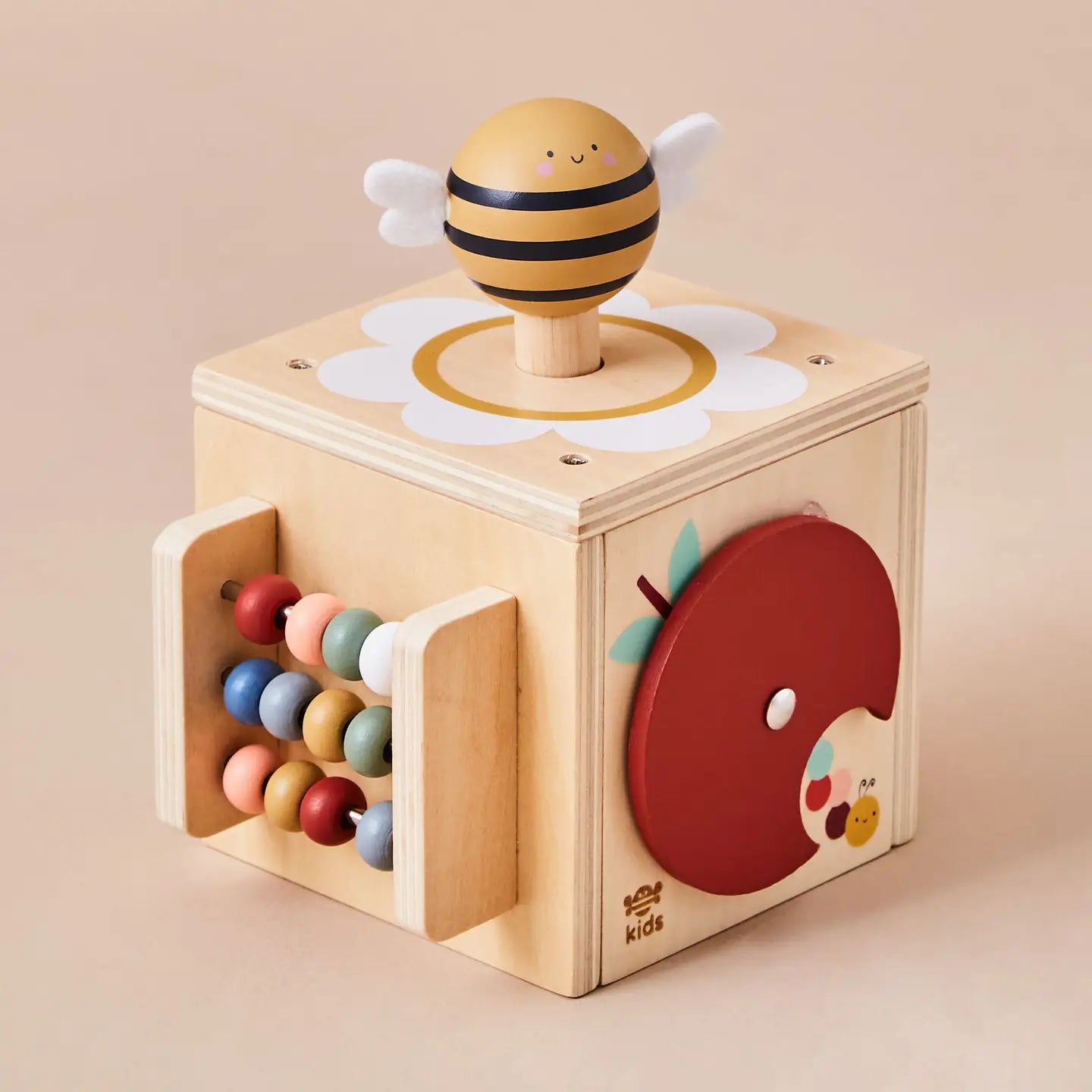 Dieser in gedämpften Grün-, Rot- und Gelbtönen gestaltete und sorgfältig aus hochwertigem Holz hergestellte Aktivitätswürfel im Mittelpunkt der Bienen ist das A und O für jedes Kinderzimmer.